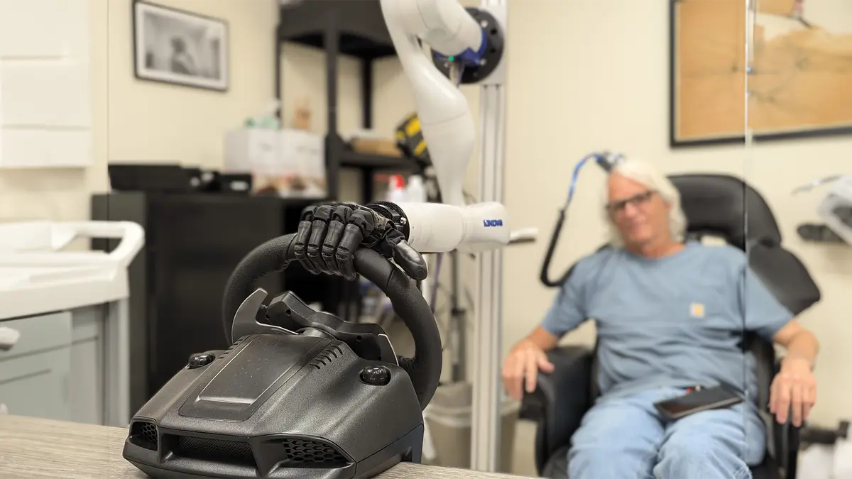 A testing participant controls a bionic hand through a brain-computer interface that allows him to feel pressure changes as the steering wheel moves in the hand. PC: University of Chicago