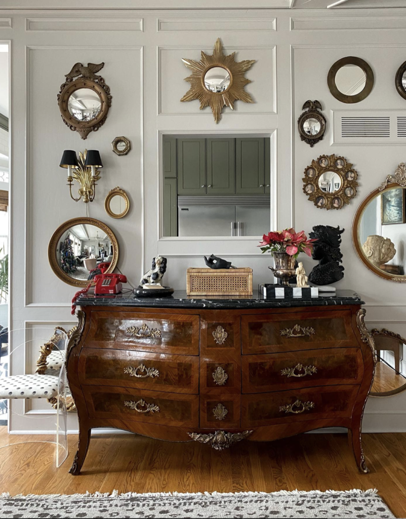 I’ve always wanted a Bombay chest. I have a small, simple, black version I bought new after we got married 13 years ago, but it’s not the same as a secondhand one with stone top and inlaid wood. This piece isn’t as old as you may think, but the price was right and the scale is good. And that marble with the ogee edge is so substantial! At 6’ wide and 3’ tall, it’s a great size, one that works well here and will be nice in the next house too. The hunt and more details were shared in the Thrift Club!
