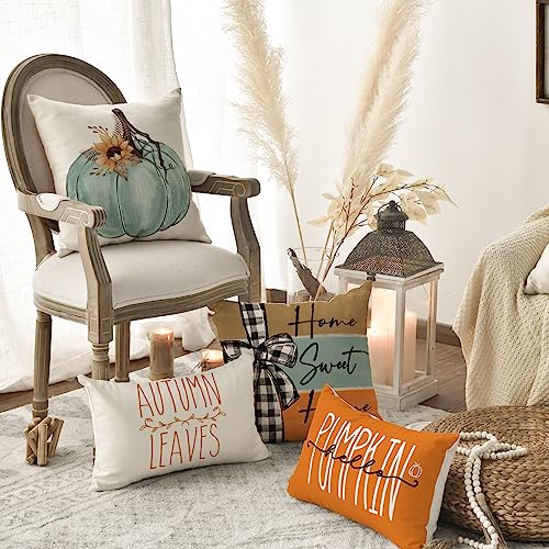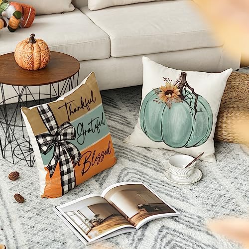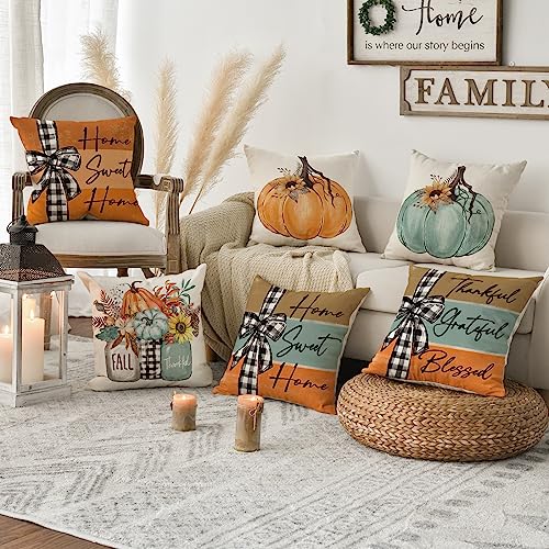 AVOIN colorlife Fall Pumpkin Home Sweet Home Throw Pillow Covers, 18 x 18 Inch Autumn Thankful Grateful Blessed Harvest Floral Decorations for Sofa Couch Set of 4