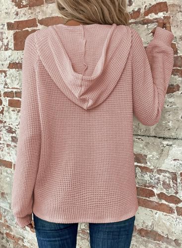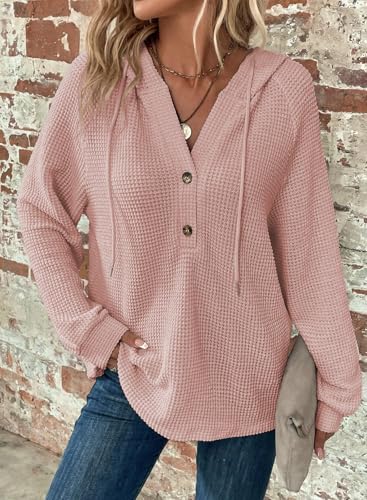 Dokotoo Hoodies for Women Waffle Knit Long Sleeve Drawstring Button V Neck Casual Pullover Sweatshirt Hooded Tops