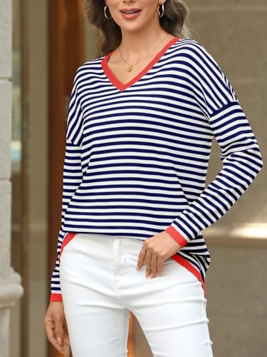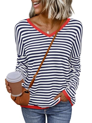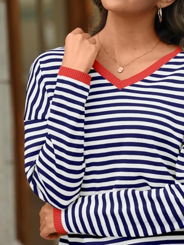 LILLUSORY Womens Long Sleeve Oversized Sweaters Fall Outfits 2024 V Neck Striped Pullover Clothes