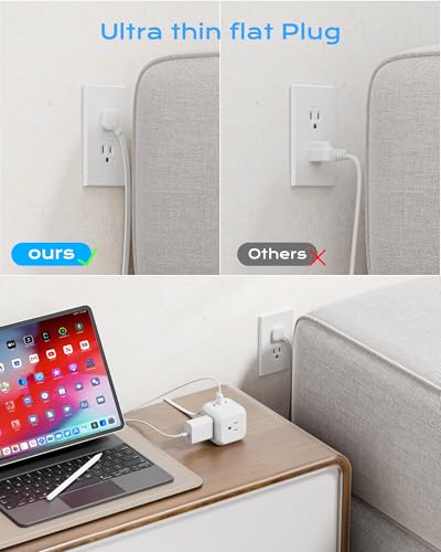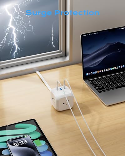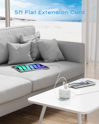 Power Strip Cube with USB Ports, 900 Joules Surge Protection, 5 ft Flat Plug Extension Cord, 3 AC Outlet 3 USB Ports(2 USB C), Desk Charging Station for Home Office Travel, White