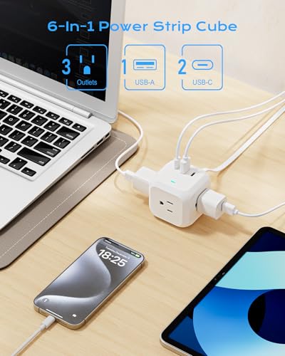 【6 IN 1 power strip】With 3 AC outlets, 2 USB-C ports, and 1 USB-A port, this compact power cube is capable of efficiently powering all your desk devices