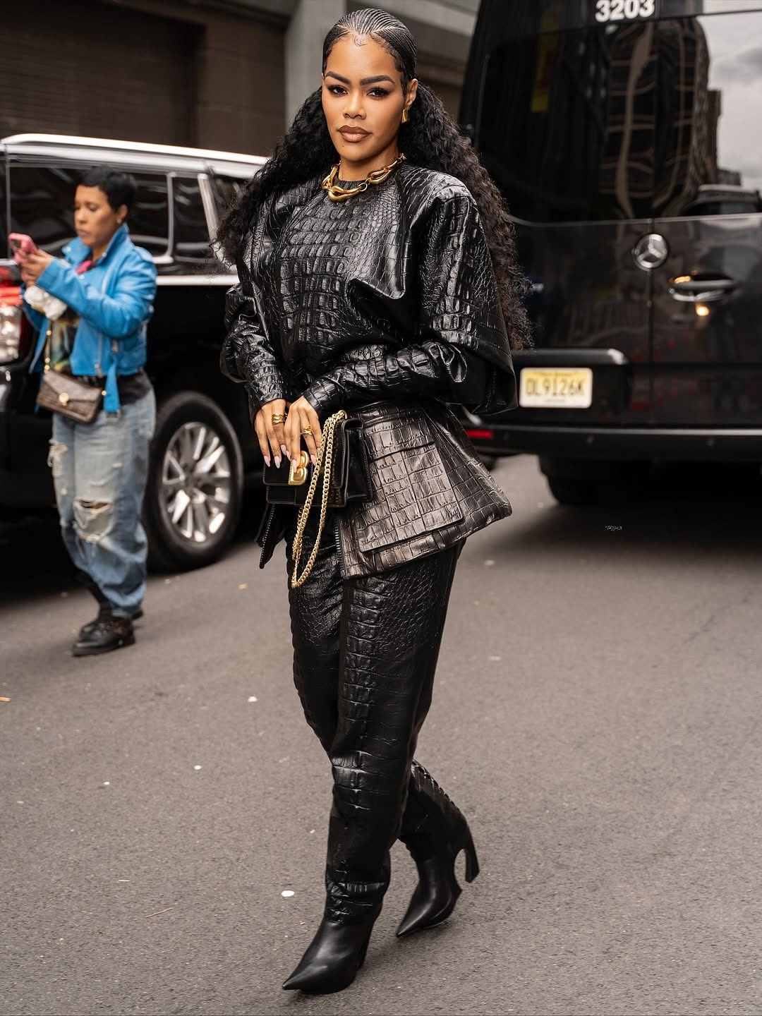 Let’s talk about that hair moment. Teyana Taylor just stepped out looking like straight up royalty with a braided hairstyle that turned every head on the street. Her sleek, laid edges, tight cornrows melting into voluminous curly lengths, this look had power, grace, and full-on boss energy. Paired with her structured all-black croc print ensemble, the entire vibe was equal parts futuristic and fashion forward. Her braids were neat, chic, and sculpted to perfection, proving once again that Teyana doesn’t just wear a look, she commands it.