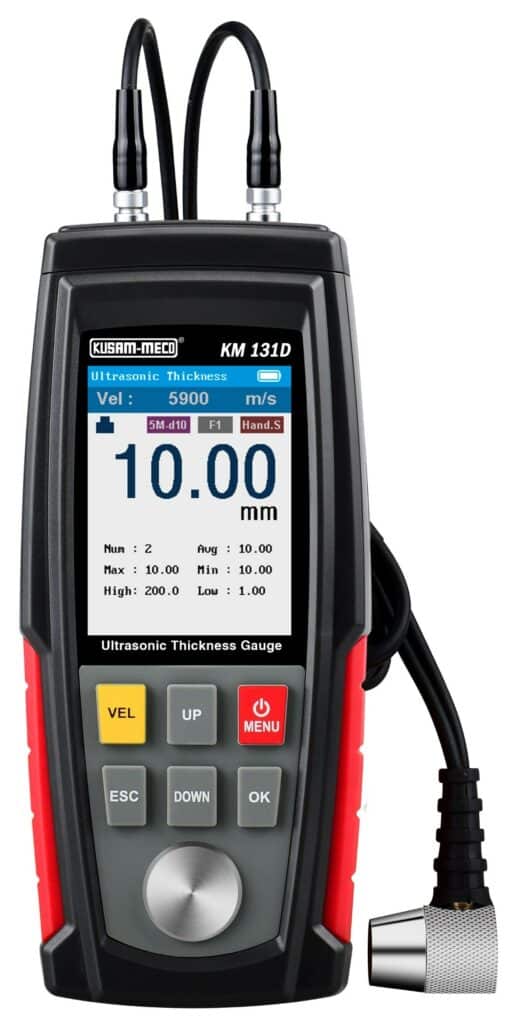 KUSAM-MECO unveils the Ultrasonic Thickness Gauge Model KM-131D, designed for quick and accurate thickness measurement. This advanced device, powered by a microprocessor, provides precise thickness measurements and sound speeds for a wide range of materials. It is engineered to excel in industrial applications, including the production environment and maintenance tasks like monitoring pipelines, pressure vessels, and corrosion levels. It effectively measures the thickness of materials that are good ultrasonic conductors with parallel top and bottom surfaces, such as metals, plastics, ceramics, and glass. The gauge’s versatility extends to materials like aluminum, copper, gold, resin, water, and glycerin, though it is unsuitable for cast iron due to its large internal particle structure.